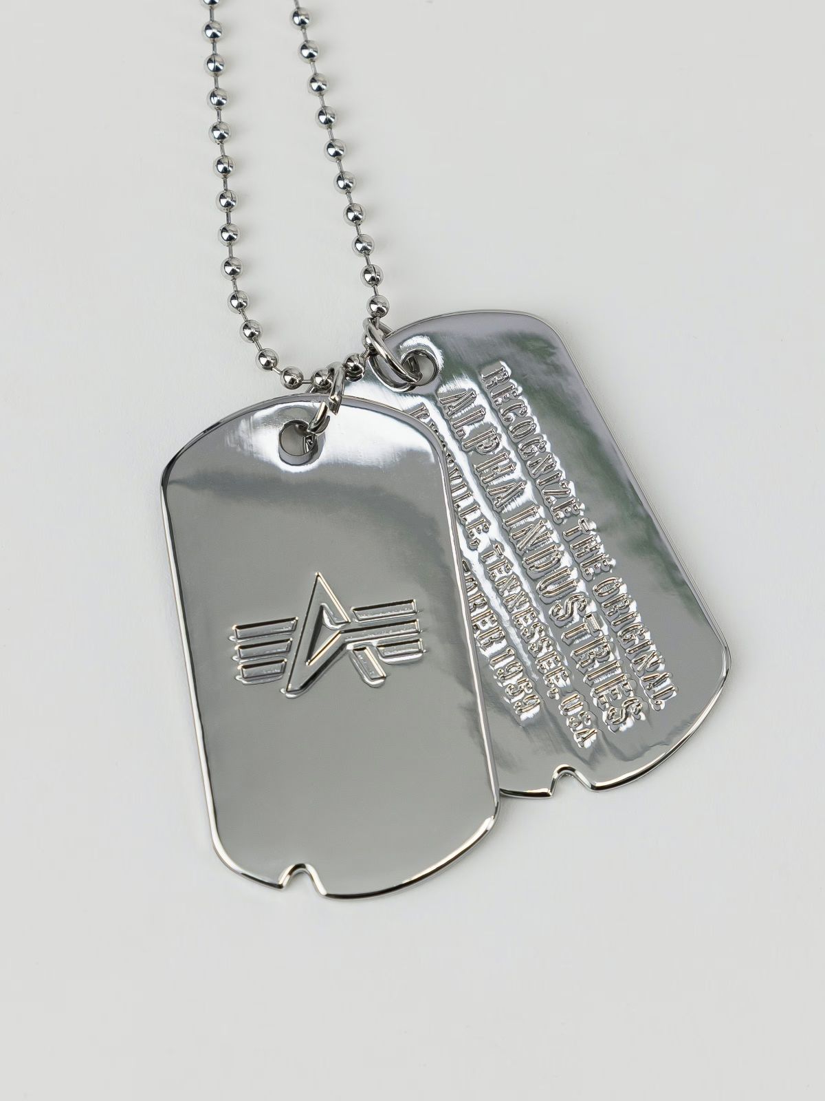 Ogni dettaglio del Dog Tag Necklace è studiato per offrire un'estetica militare raffinata. Su un lato, il logo Alpha Industries è inciso con cura, mentre l'altro lato si distingue per un lettering audace che porta un messaggio deciso. La finitura lucida della lega metallica sottolinea l'eleganza del design, mentre la catena a sfera assicura una vestibilità sicura e confortevole per ogni giornata.