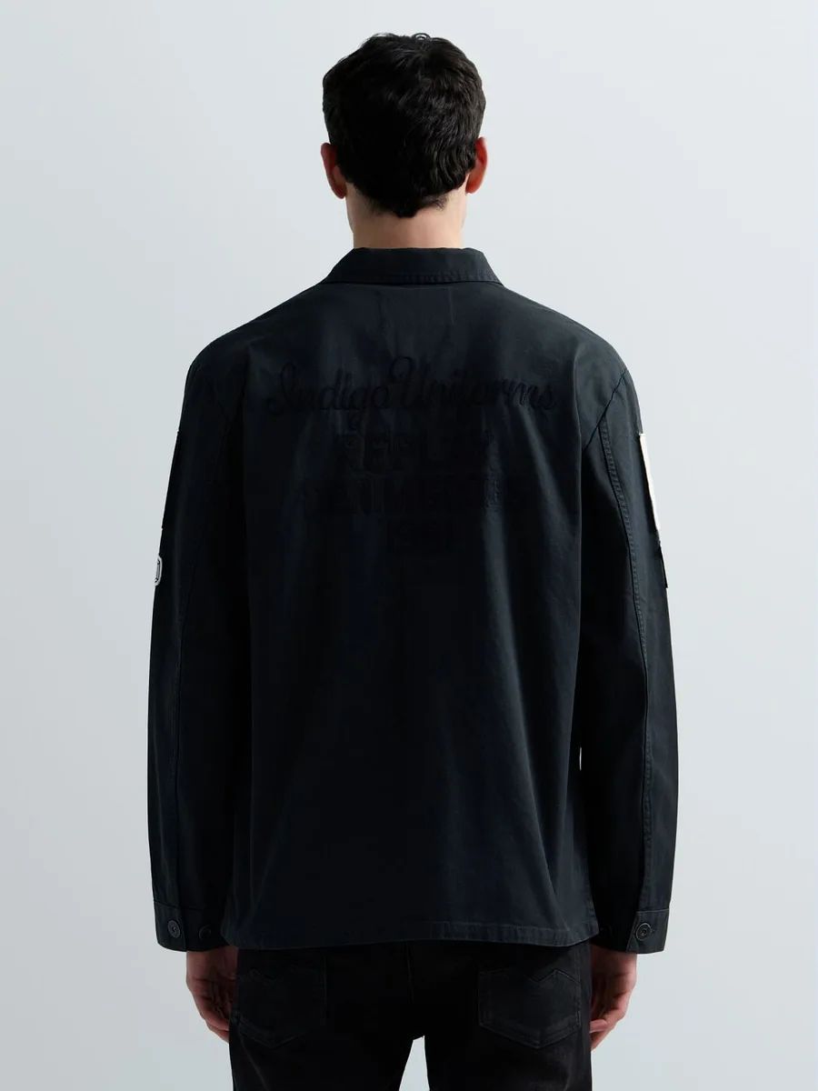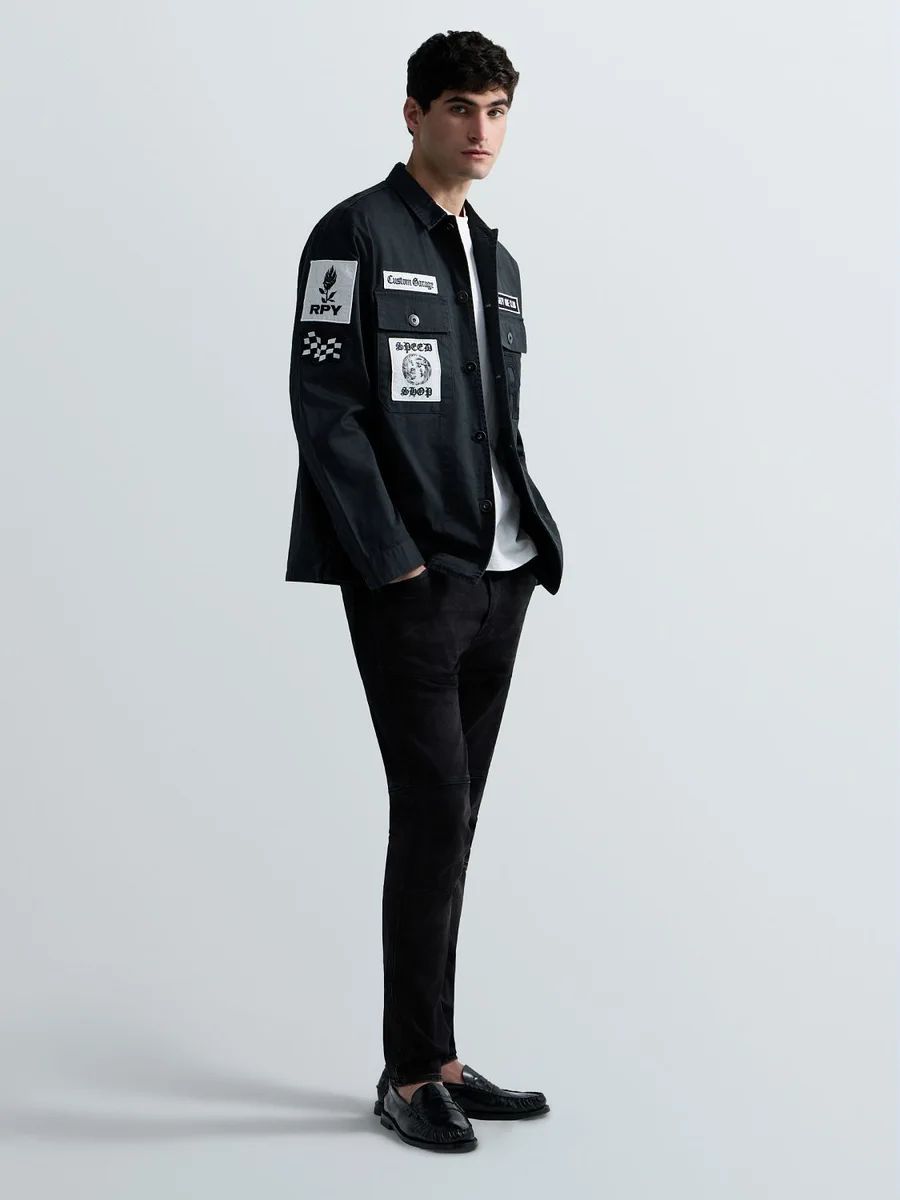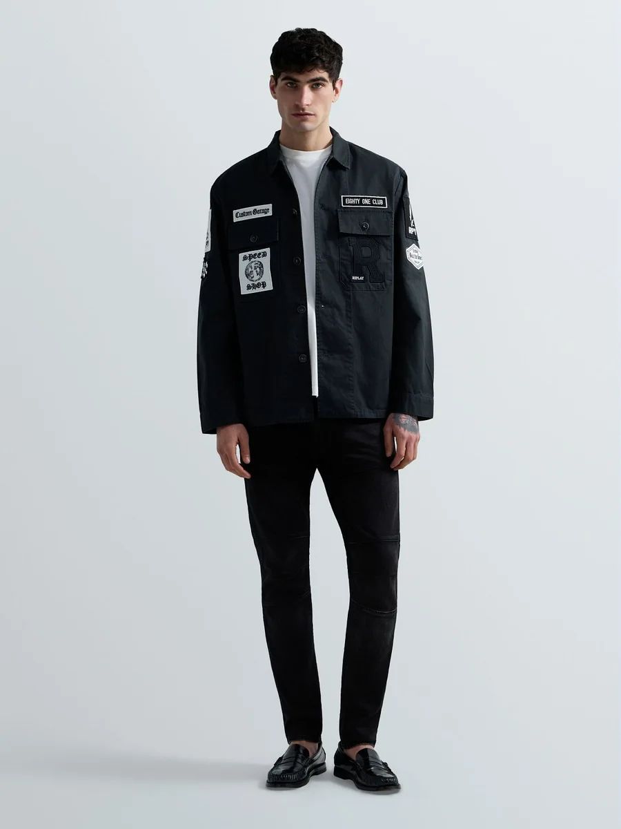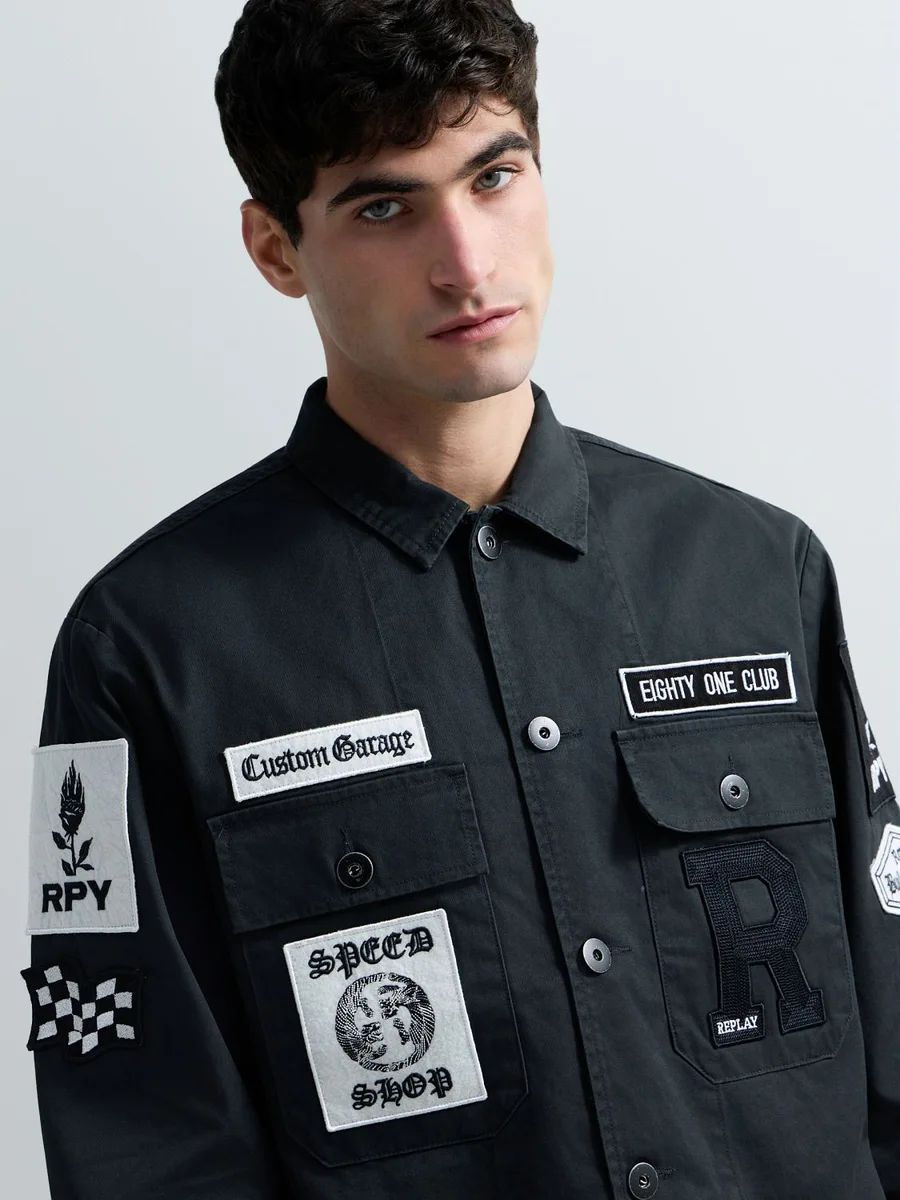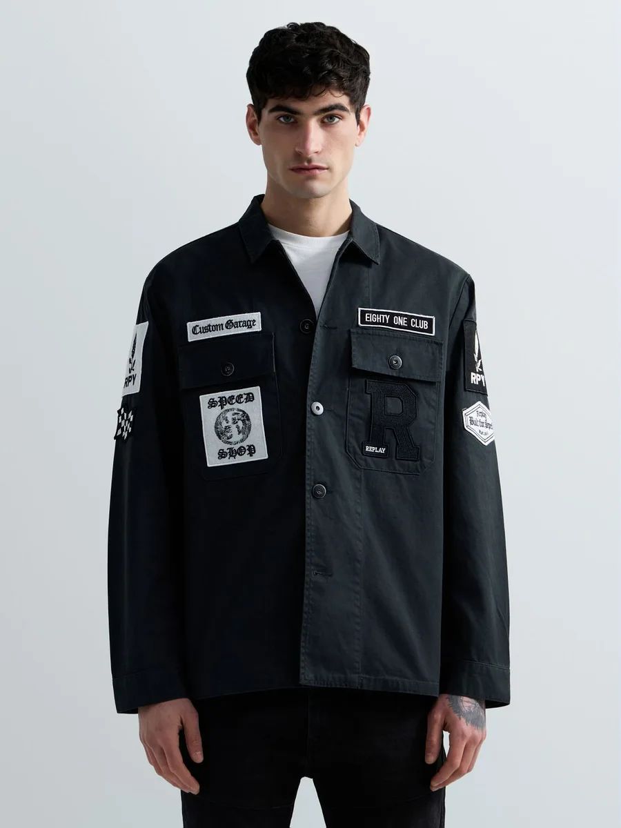 Giacca camicia dalla vestibilità regolare realizzata in puro cotone e dotata di polsini con doppio bottone e due tasche con patta ebottone sul petto. Il modello si caratterizza per le patch personalizzate sul davanti e sulla manica, l'emblematica R ricamata in versione maxi su una delle tasche e il lettering ricamato sul retro. Chiusura frontale con bottoni.