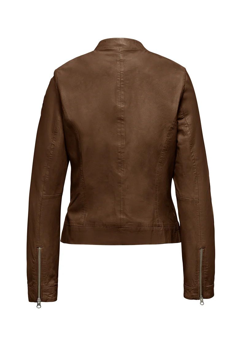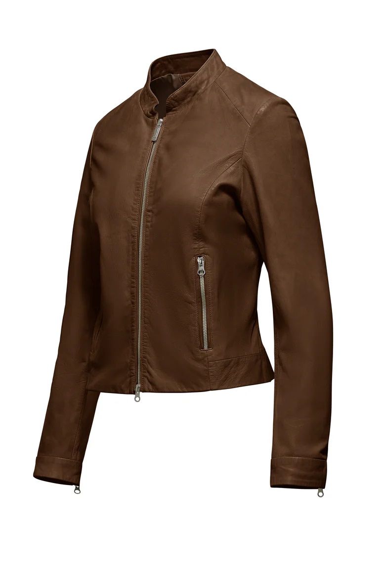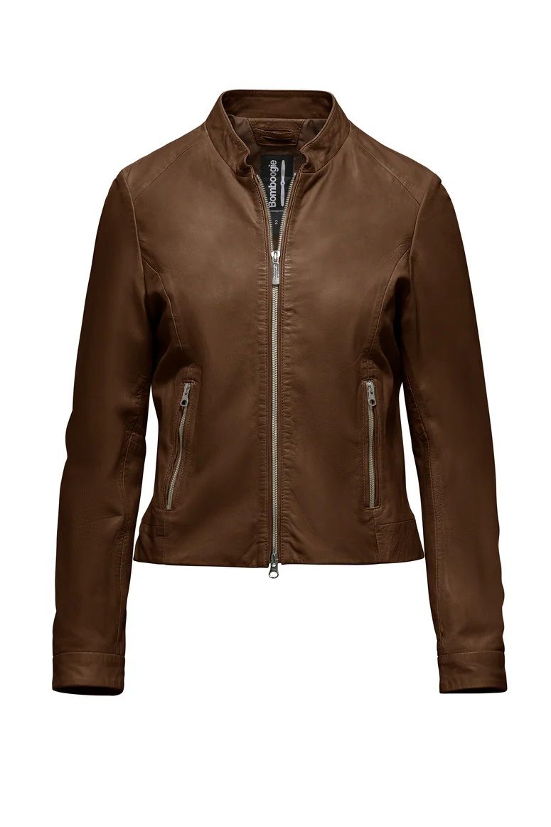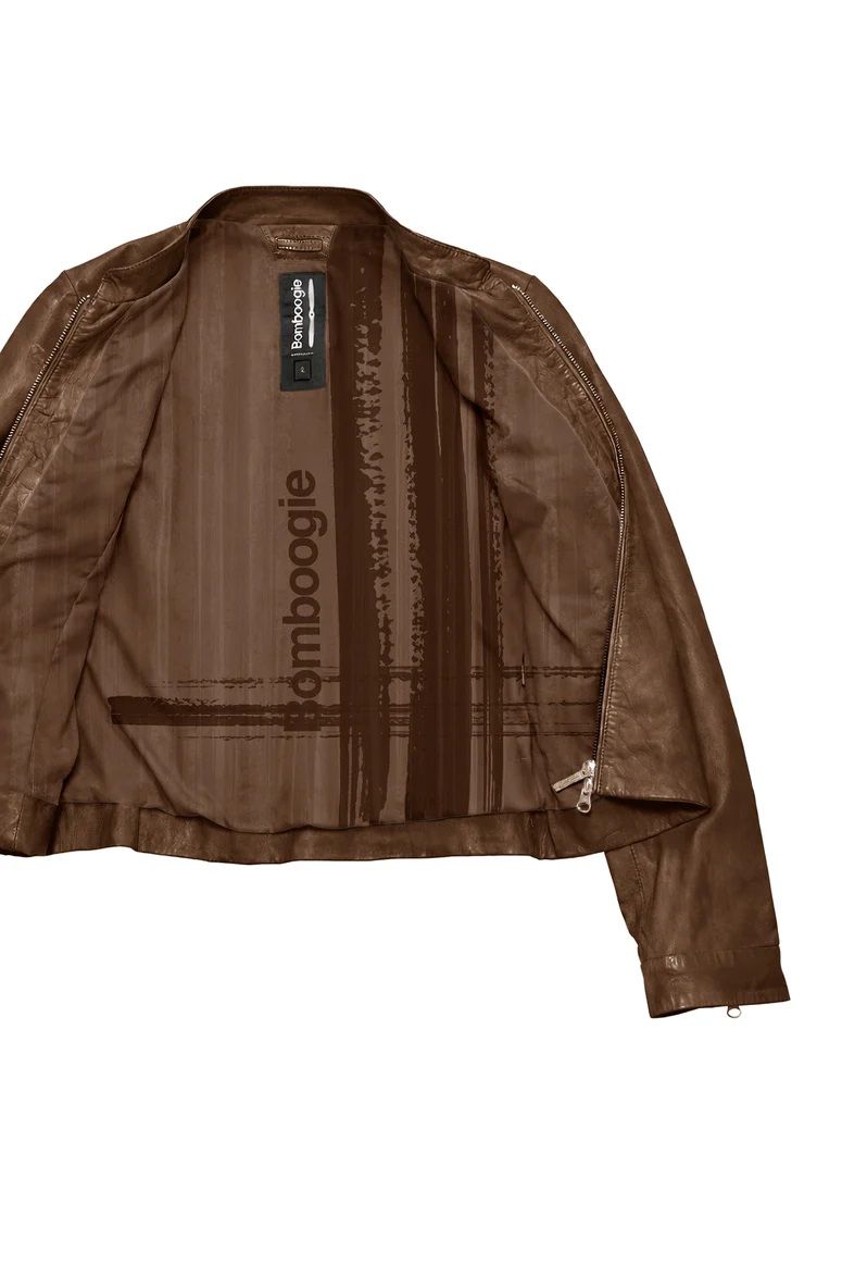 Vestibilità slim pelle di pecora lavorata collo in piedi chiusura con zip fodera interna stampata 100%pelle