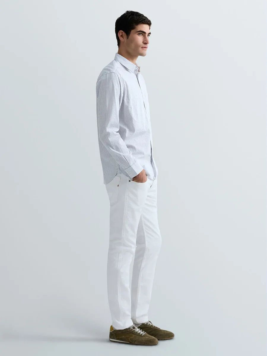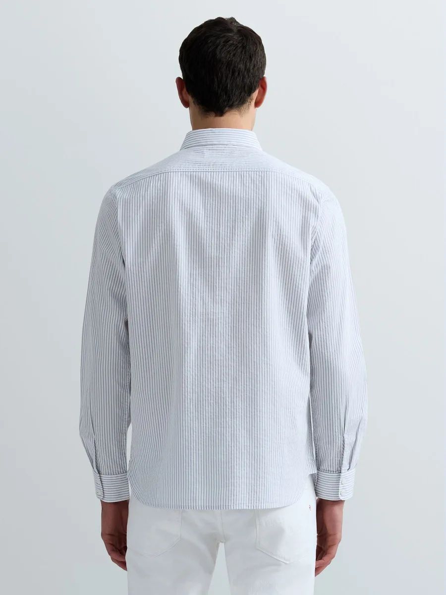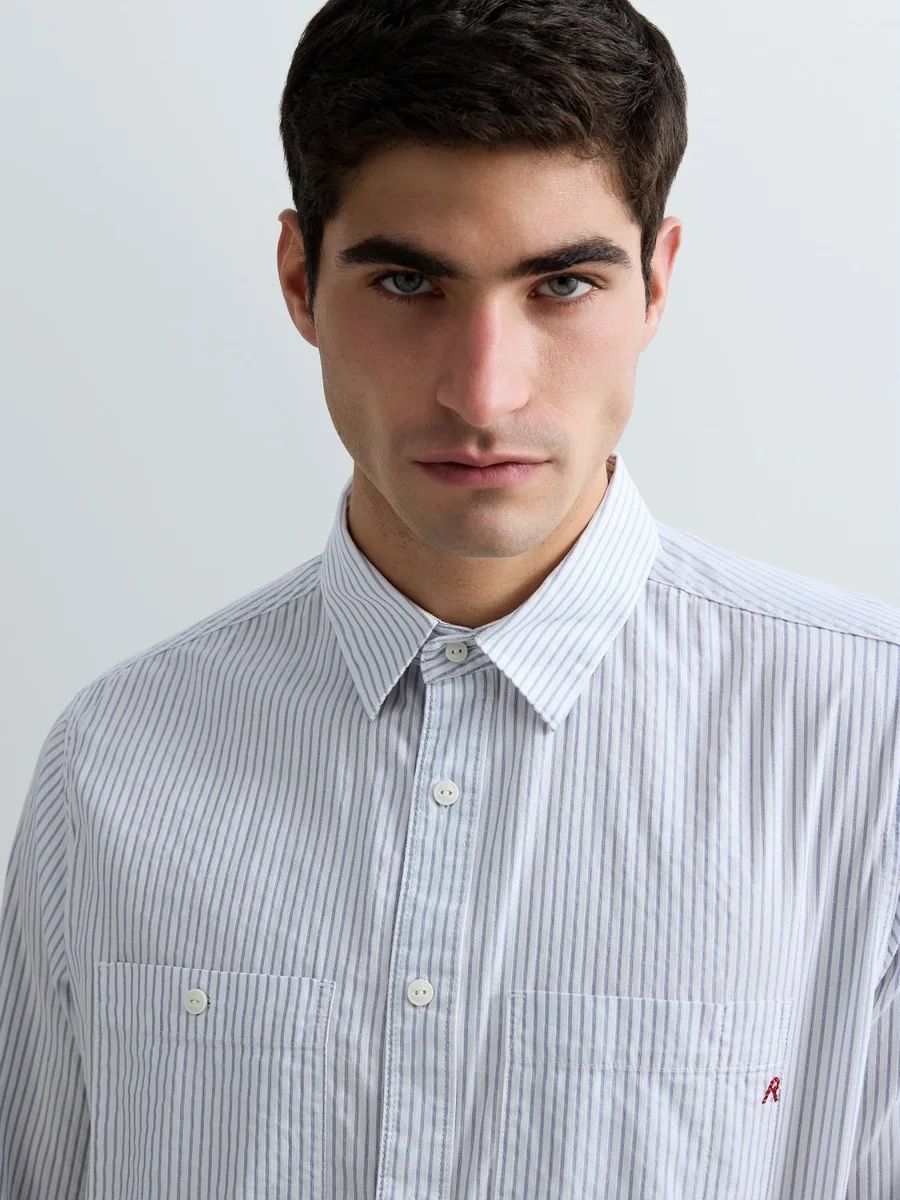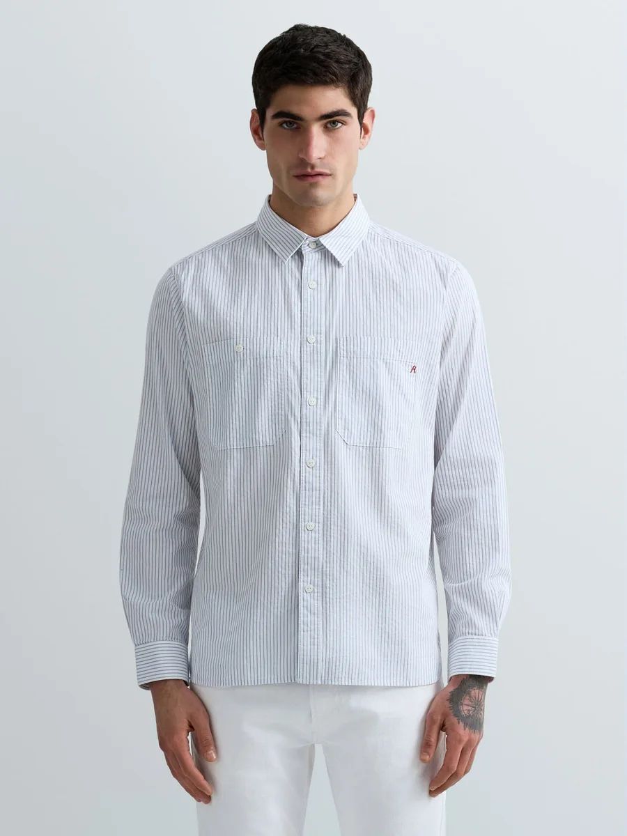 Camicia dalla vestibilità regolare realizzata in cotone dobby tinto in filo con motivo a righe verticali sottili all over. Il modello a maniche lunghe presenta un orlo stondato, una chiusura con bottoni, ripresi anche in corrispondenza dei polsini, e due tasche sul petto: una chiusa con bottone e l'altra rifinita dall'iconico dettaglio R ricamato in rosso.